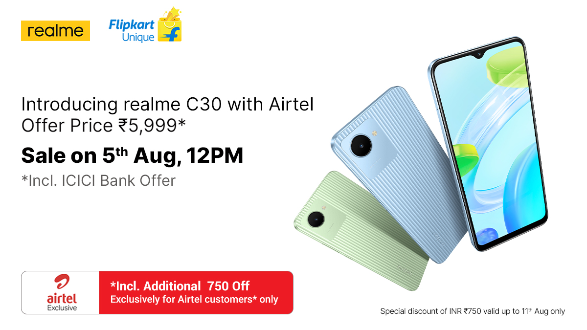 The Realme C30 price in India starts at ₹7,499. However, as a part of bundle offer, buyers can purchase the Realme C30 2GB + 32GB variant at just ₹5,999. On the other hand, the 3GB + 32GB variant will cost ₹6,799. Do note that the Airtel offer is valid till August 11 only.